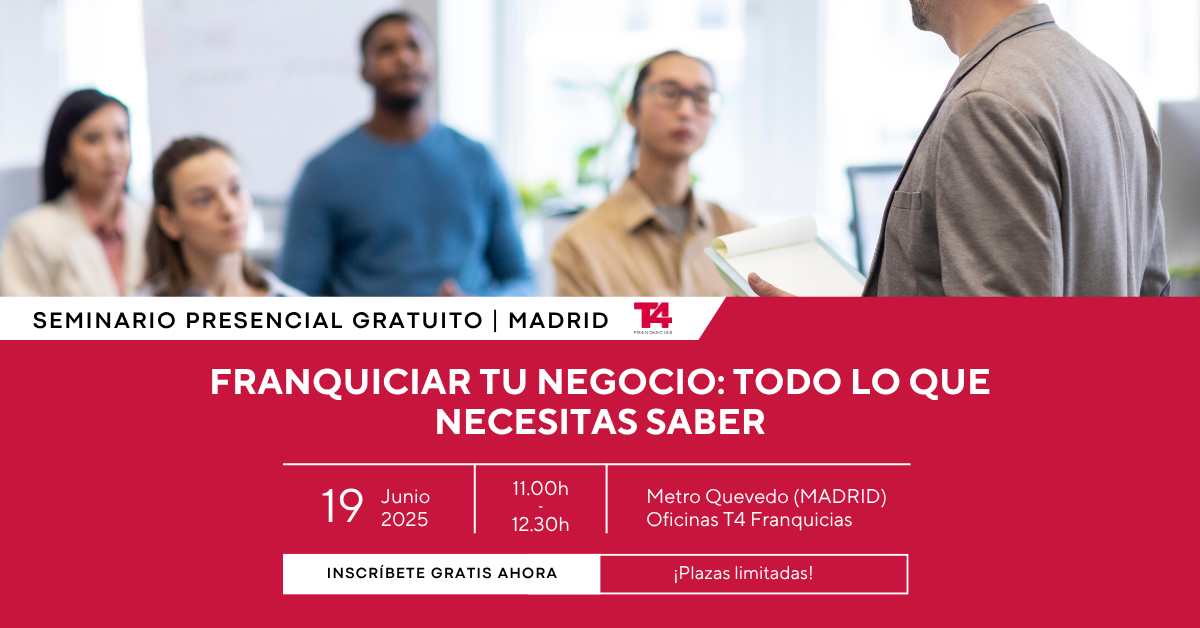 El seminario es gratuito, pero las plazas son limitadas. Puedes inscribirte haciendo clic aquí, enviando tus datos a comunicacion@t4franquicias.com o llamando al 91 626 39 29