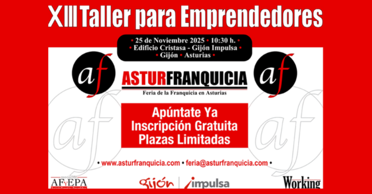 El martes 25 de noviembre de 2025, a partir de las 10:30 h, y en el marco de celebración de AsturFranquicia, Feria de la Franquicia en Asturias, tendrá lugar la XIII Edición del Taller para Emprendedores.